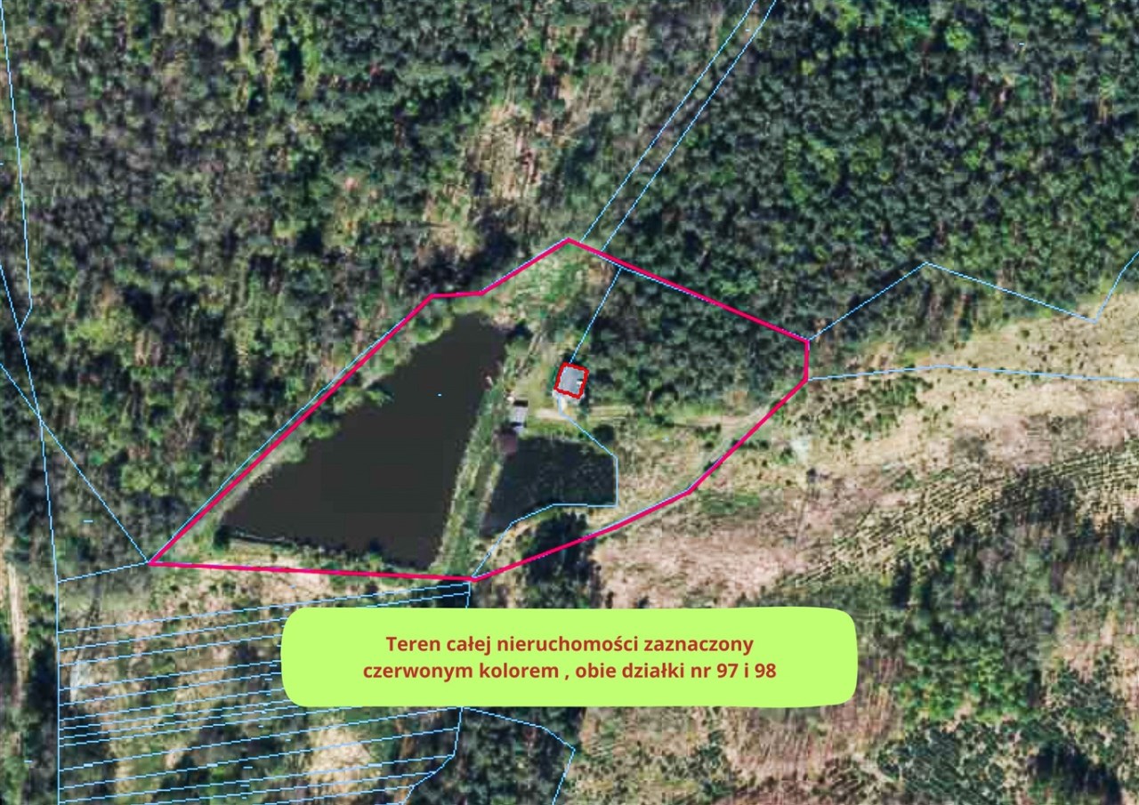 Dojazd do nieruchomości jest prowadzony nieutwardzoną drogą leśną wiodącą przez sam środek lasu.