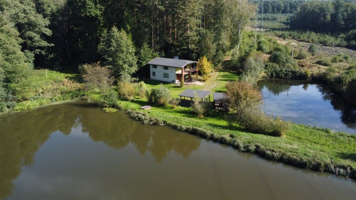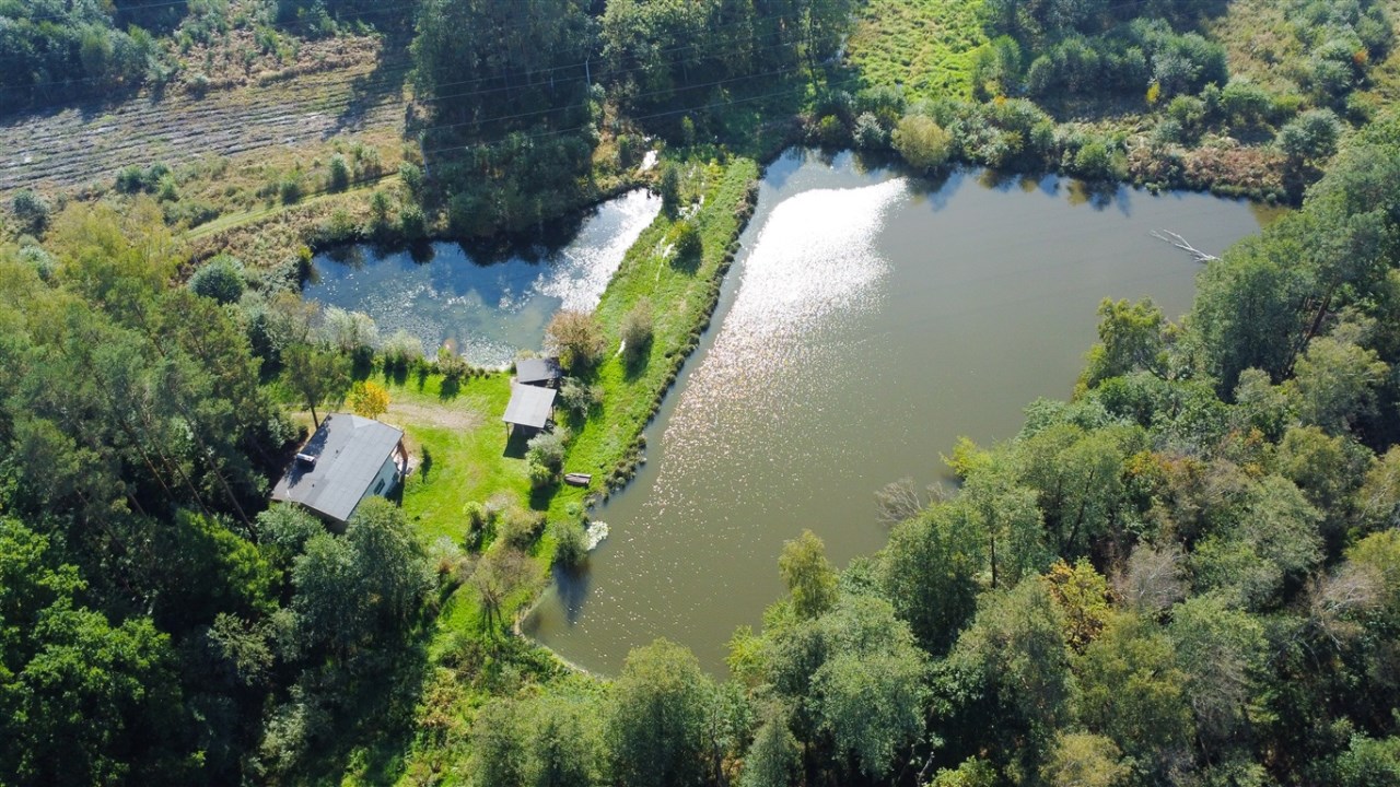 -Z okien widok na dwa stawy oraz otaczającą zieleń i las.