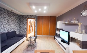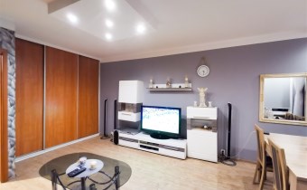- W salonie duża szafa zabudowana + szafka RTV + sofa i stolik