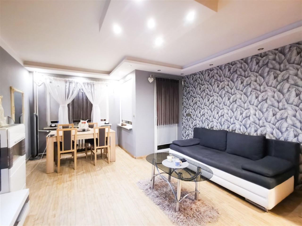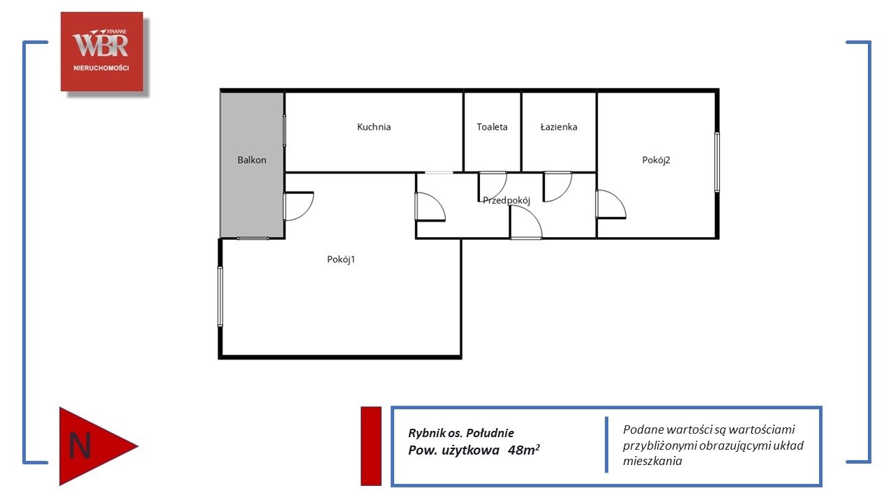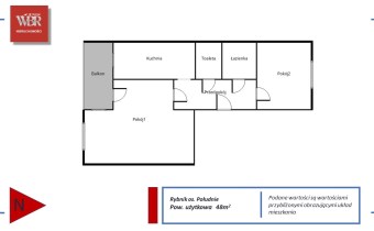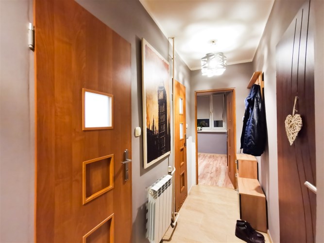 Mieszkanie składa się z 2 przestronnych pokoi, kuchni, łazienki, toalety i przedpokoju. Z salonu jest wejście na duży balkon typu loggia. Ekspozycja słoneczna na stronę północ - południe.